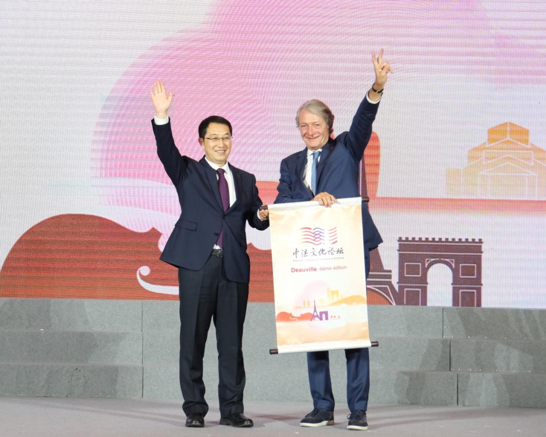 闭幕式现场举行了第六届中法文化论坛主办城市交接仪式,江苏省苏州市市长吴庆文把象征论坛在中法两国城市之间轮替举办的会旗交到法国多维尔市长菲利普·奥吉尔手中。