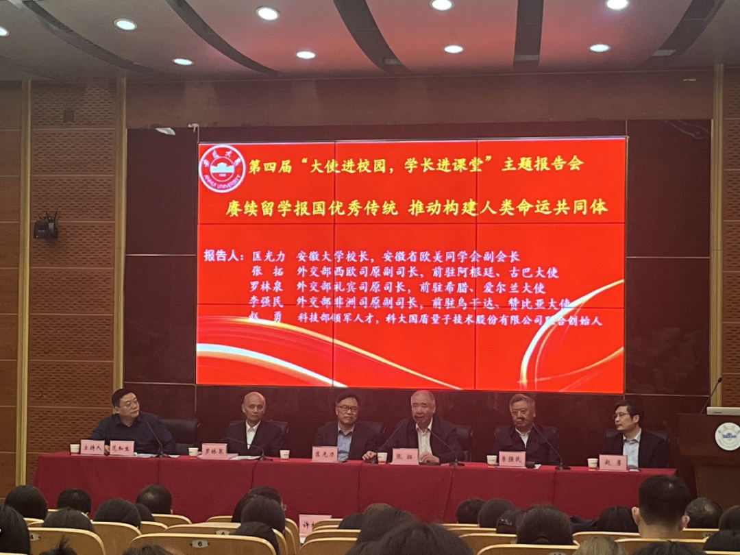 近日,安徽欧美同学会、欧美同学会拉美分会、安徽大学在安徽大学共同举办“大使进校园,学长进课堂”活动,以“赓续留学报国优秀传统 推动构建人类命运共同体”为主题,以报告会形式庆祝欧美同学会成立110周年。