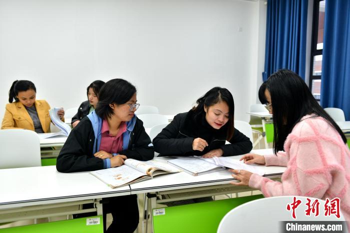 近日,从菲律宾来到福建师范大学海外教育学院求学的乔乐琳(右二)和林雅恩(右三)一同学习。 中新网记者 吕明 摄