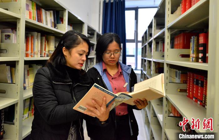 在福建师范大学海外教育学院求学的乔乐琳(左一)和林雅恩(左二)在借阅室翻阅书籍。 中新网记者 吕明 摄