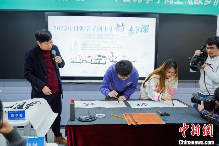 此次课堂还设置了形式多样的云互动。在“赞美我的故乡”环节上,中日韩学子分享其故乡的美食美景;而在书法互动环节上,中日韩学子与中国书法家喻革良老师同写“故乡”二字。