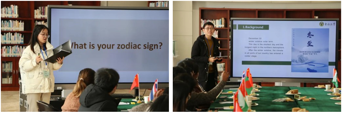 论坛上,来自东南大学材料科学与工程学院的本科生朱天文、交通学院的本科生钟嘉媛分别做了有关二十四节气和十二生肖的主题报告,从含义由来、相关文化习俗等角度进行了介绍。激发了国际学生对中国传统文化的兴趣,加深了大家对中华文化的理解。