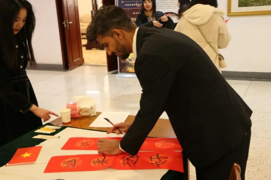 临近中国农历新年,中外学生共写书法,学写福字春联、互送祝福,在非遗文化实践中感受中国传统文化的魅力,喜迎福韵新年。来自巴基斯坦的迈德对中国书法非常感兴趣,他说:“用毛笔写字很神奇,我用毛笔写下新年祝福,希望新的一年越来越好,大家都能心想事成。”