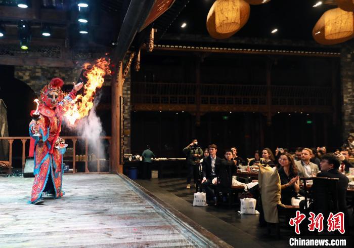 1月7日,四川成都,中美青年交流联谊会举行,美国高校学子看川剧绝技吐火表演。王磊 摄