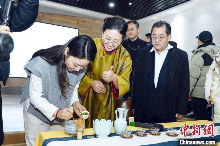 注水、击浮、捣碎、筛茶、调膏、加水、点茶……在非遗展示环节,韩国籍外教吴俊馨跟茶艺师学习点茶技艺,她还在茶汤上写下“中国”二字,表达对中国传统文化的喜爱。