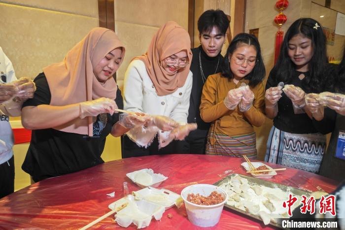 2月3日,广西民族大学举办留学生春节团拜会活动。图为留学生在包饺子。陈冠言 摄