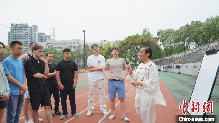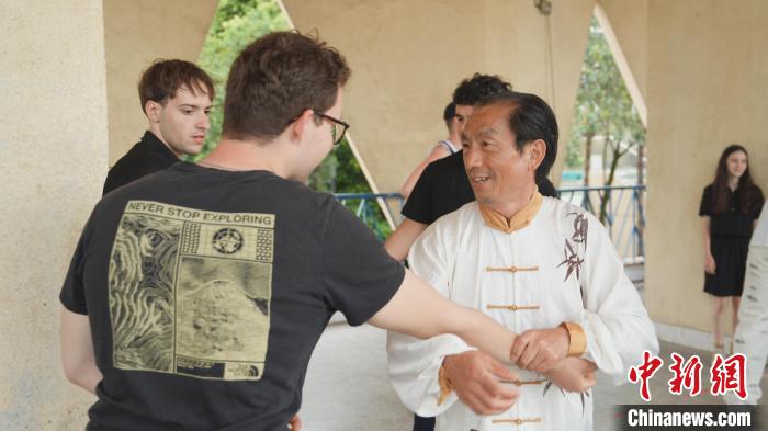 图为西南交大老师刘剑荣(右)为德国师生讲解太极拳的知识。 廖海 摄