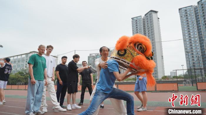 图为西南交大老师刘剑荣(右)教德国学生马昊阳舞狮子。 廖海 摄