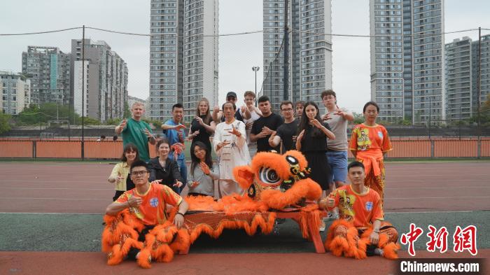 图为德国师生学习舞狮子后,与中国师生合影留念。 廖海 摄