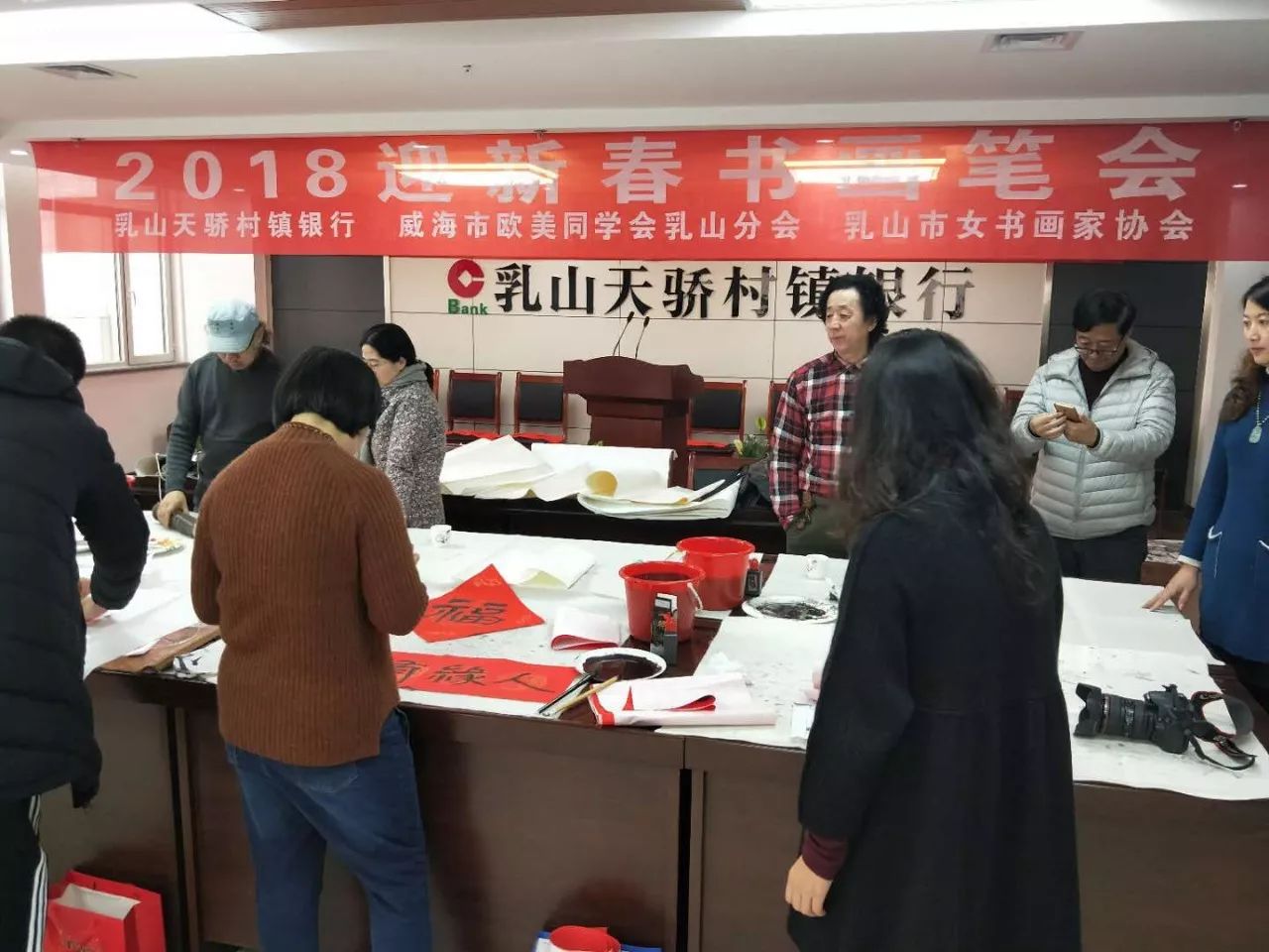 2018年1月21日上午,乳山天骄村镇银行会议室热闹非凡,由威海市欧美同学会乳山分会、乳山天骄村镇银行和乳山市女书画家协会共同组织的2018年迎新春书画笔会在这里如期举行。