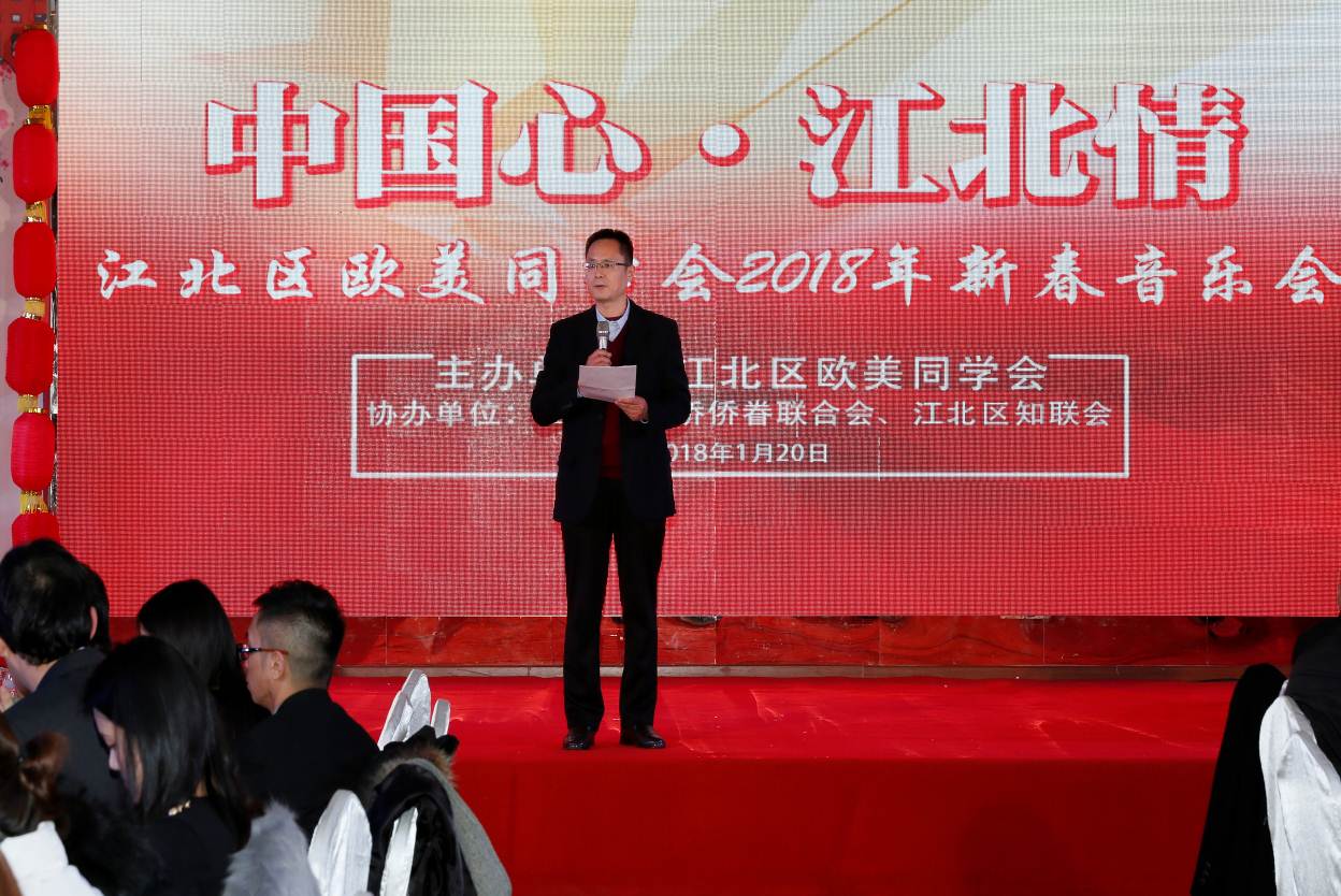 近日,重庆市江北区欧美同学会举办“中国心 •江北情” 2018年新春音乐会, 100余名留学人员、 30余名归侨侨眷代表和 20余名党外知识分子代表欢聚一堂,共迎新春。江北区委常委、统战部部长郑学伦,重庆欧美同学会副会长、江北区欧美同学会会长谢新,重庆欧美同学会党组成员赵东平、黄艳以及区委统战部、区侨联、区知联会负责同志等出席了晚会。