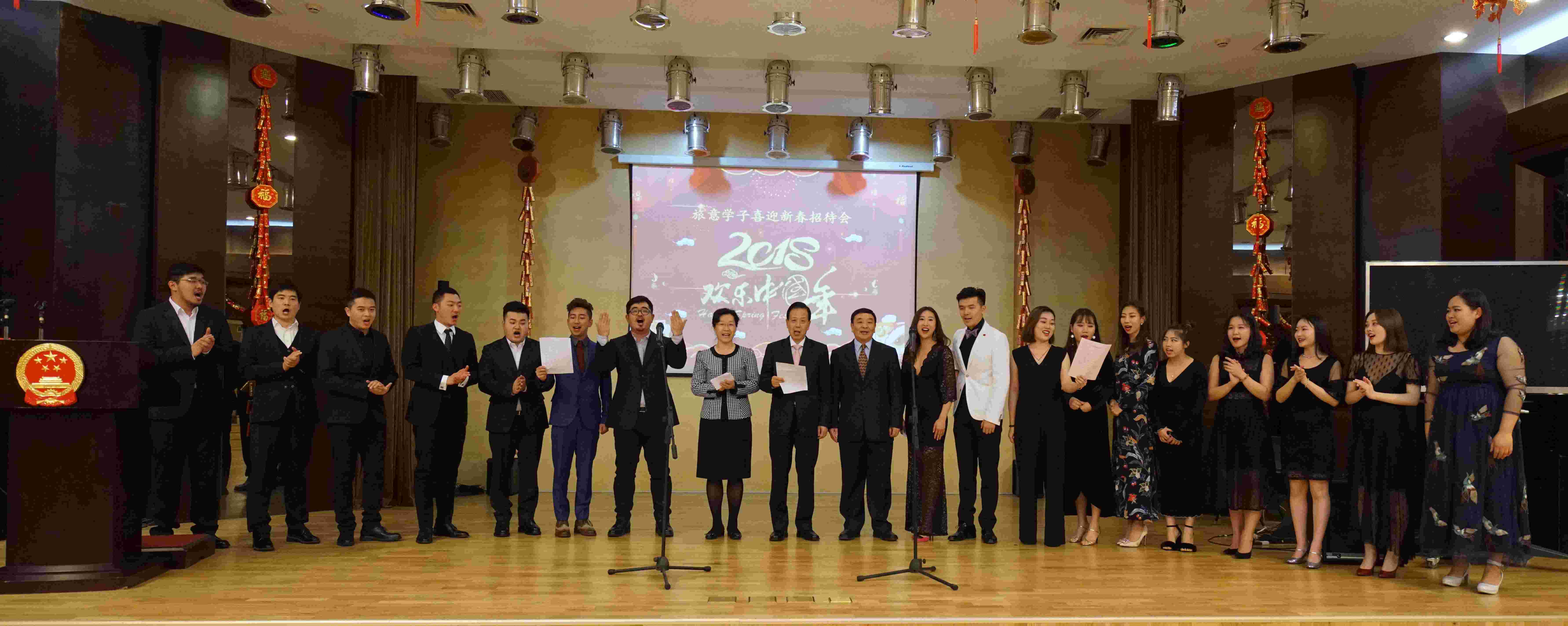 招待会上,来自罗马音乐学院、罗马舞蹈学院、博洛尼亚大学等院校的留学生演出了高水平的舞蹈、歌曲、乐器演奏等文艺节目,现场欢歌笑语、充满青春活力。节目的最后,李大使及与会外交官同全体演职人员共同登台,合唱《歌唱祖国》,将现场气氛推向高潮。