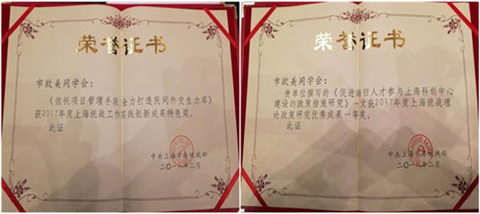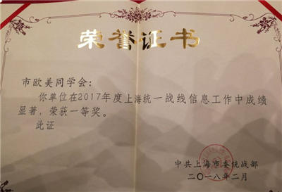 上海市欧美同学会《促进海归人才参与上海科创中心建设的政策措施研究》获上海统战理论政策研究优秀成果一等奖,《依托项目管理手段,全力打造民间外交生力军》获上海统战工作实践创新成果特色奖。我会荣获上海统战信息工作一等奖,陈卓君同志荣获优秀信息员。朱玲玲副会长兼秘书长代表我会在大会上作了《海聚力量携归奉献》的交流发言。