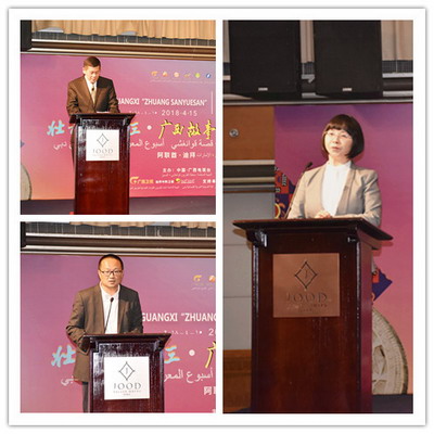 广西卫视副总编辑颜兵在致辞中详细介绍《壮族三月三·广西故事》的制作过程,该节目是由广西卫视在著名的专题类栏目《广西故事》基础上,精选制作的讲述广西独特人文历史、民族文化和自然资源的中阿双语节目。他表示,节目将在迪拜中阿卫视上展播一周,希望通过此次展播,可以透过迪拜向世界讲述广西故事。